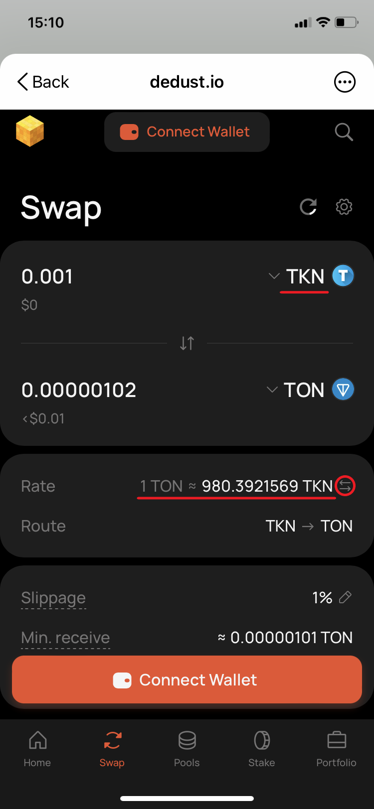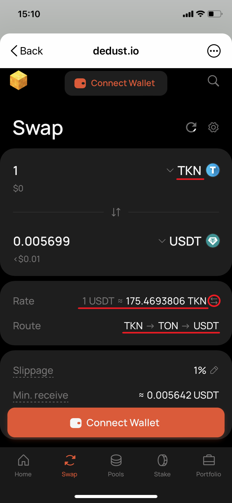Thankfully to that DeDust.io has an automatic routing feature, even not having yet a USDT pair with your token, you can also easily check the correctness of your calculations using the Swap page. Let's have a look at the existing rates on DeDust.io, in both directions, for both direct and inverse rate. To demonstrate the above we'll use micro amounts in this example, as the liquidity in the TKN/TON pool is quite low. There's just no TON and TKN in the pool to make trades for amounts over $5. And even every $1 would be equal to almost 20% of the total pool value. That would substantially impact the token price and distort the calculations.