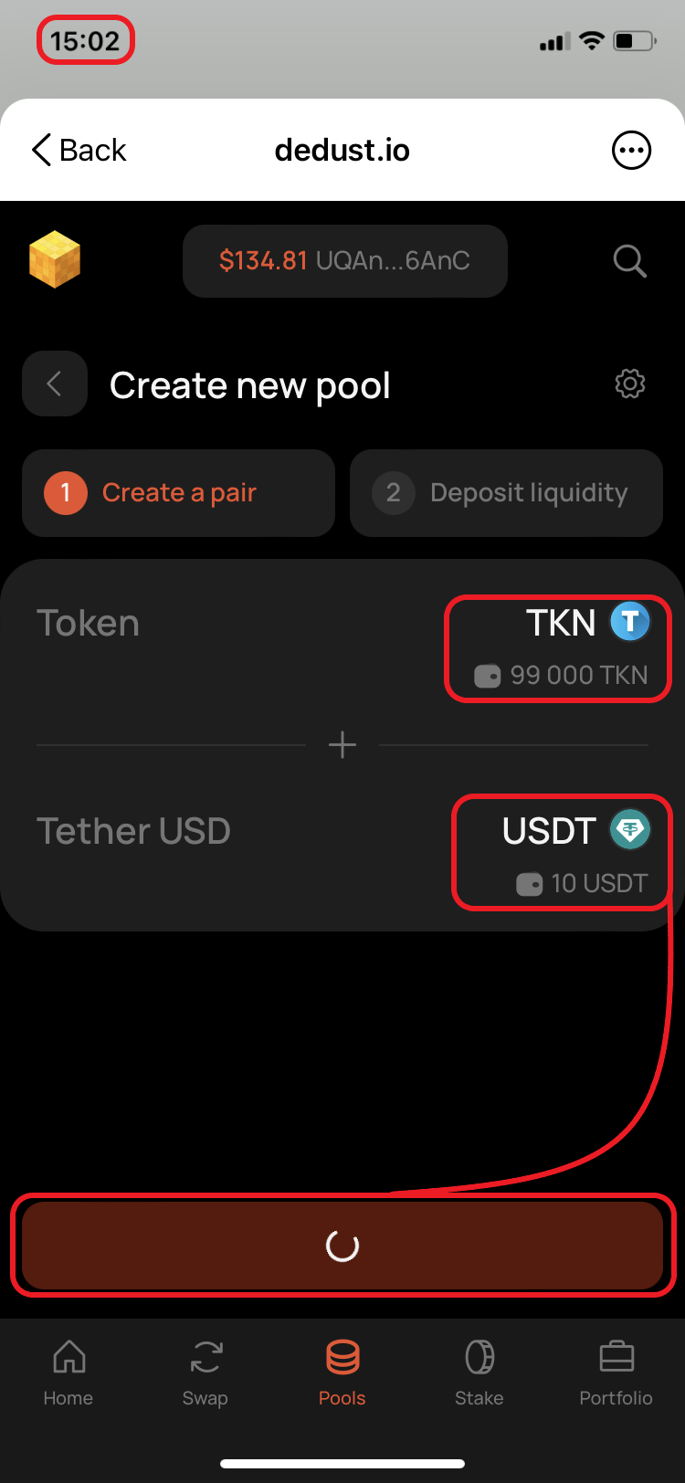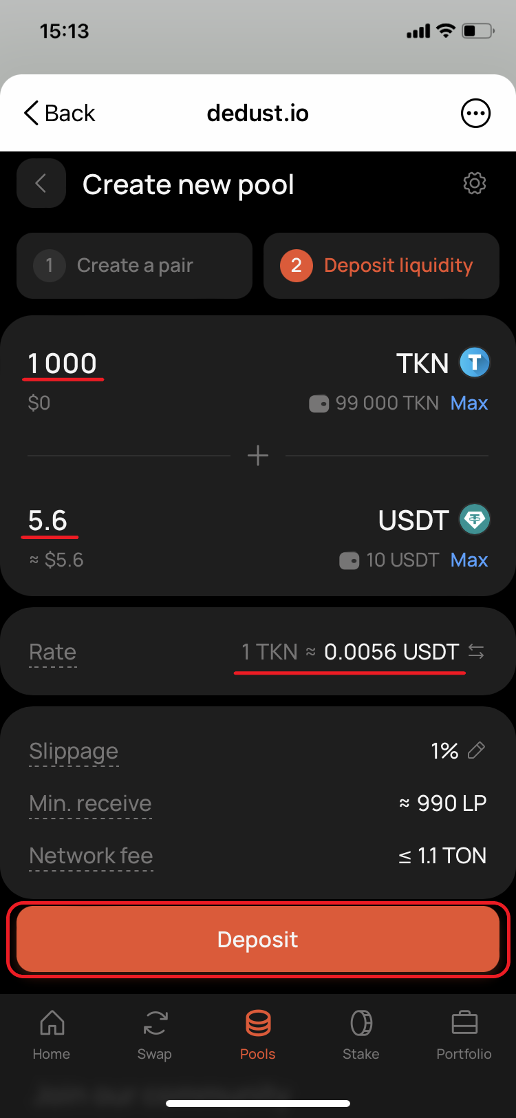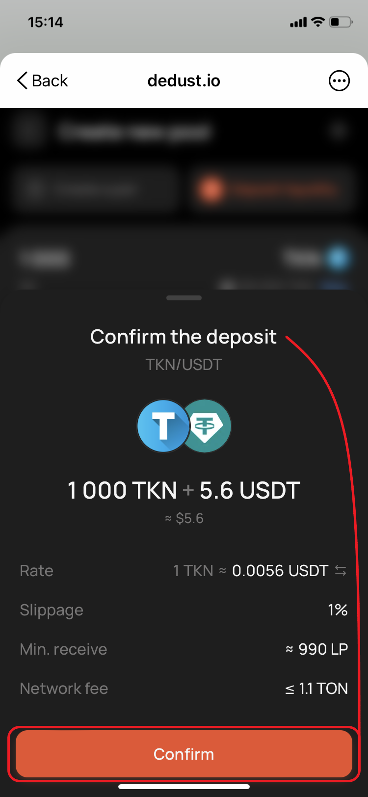 As a result of successful liquidity deposit you will get LP (liquidity provider) tokens into your wallet (DeDust Pool: TKN/USDT in our case) that will serve as a proof of your ownership of the tokens deposited to the pool. Handle these LP carefully. If you don't see the LP tokens in your wallet check the wallet app assets display settings.
