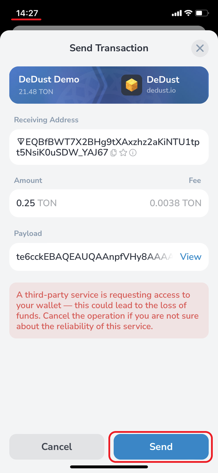 Make sure that you have at least 1.50 TON in your wallet to cover the blockchain fees. Keep in mind that for all further transactions (including the liquidity withdrawal, if you decide to) you'll also need TON to cover the network fees. Now confirm the transaction.
