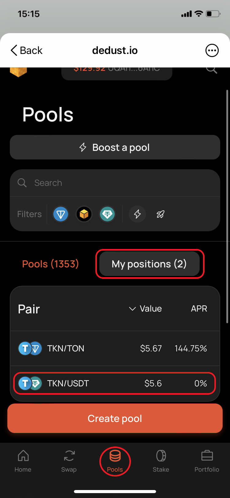After all confirmations you'll get a notification at DeDust. The process may take few minutes. Press 'Open the pools list'.