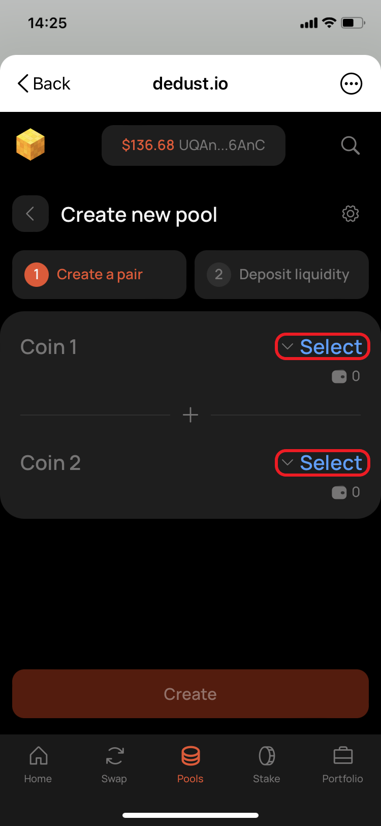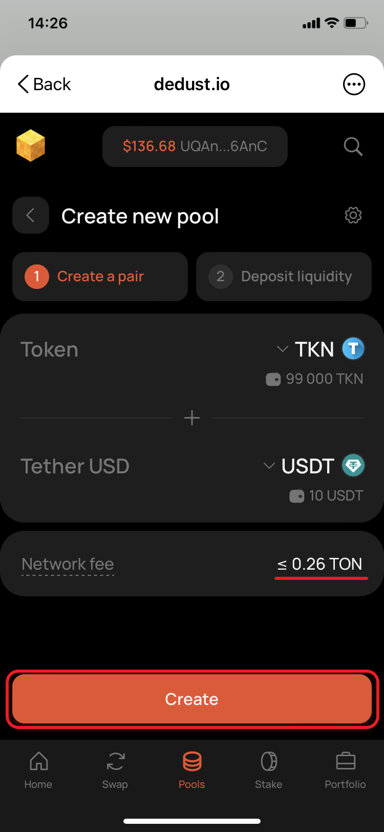 After tokens on both sides are selected press 'Create' to complete the first step. It will require β0.26 TON to cover the network fees. A little less compared to those withheld in the step 7 in Deposit new token flow (look through steps 6-8 for clearer understanding) as now the vault for the token at DeDust already exists and we only need to create a pair. Here's an example of such transaction.