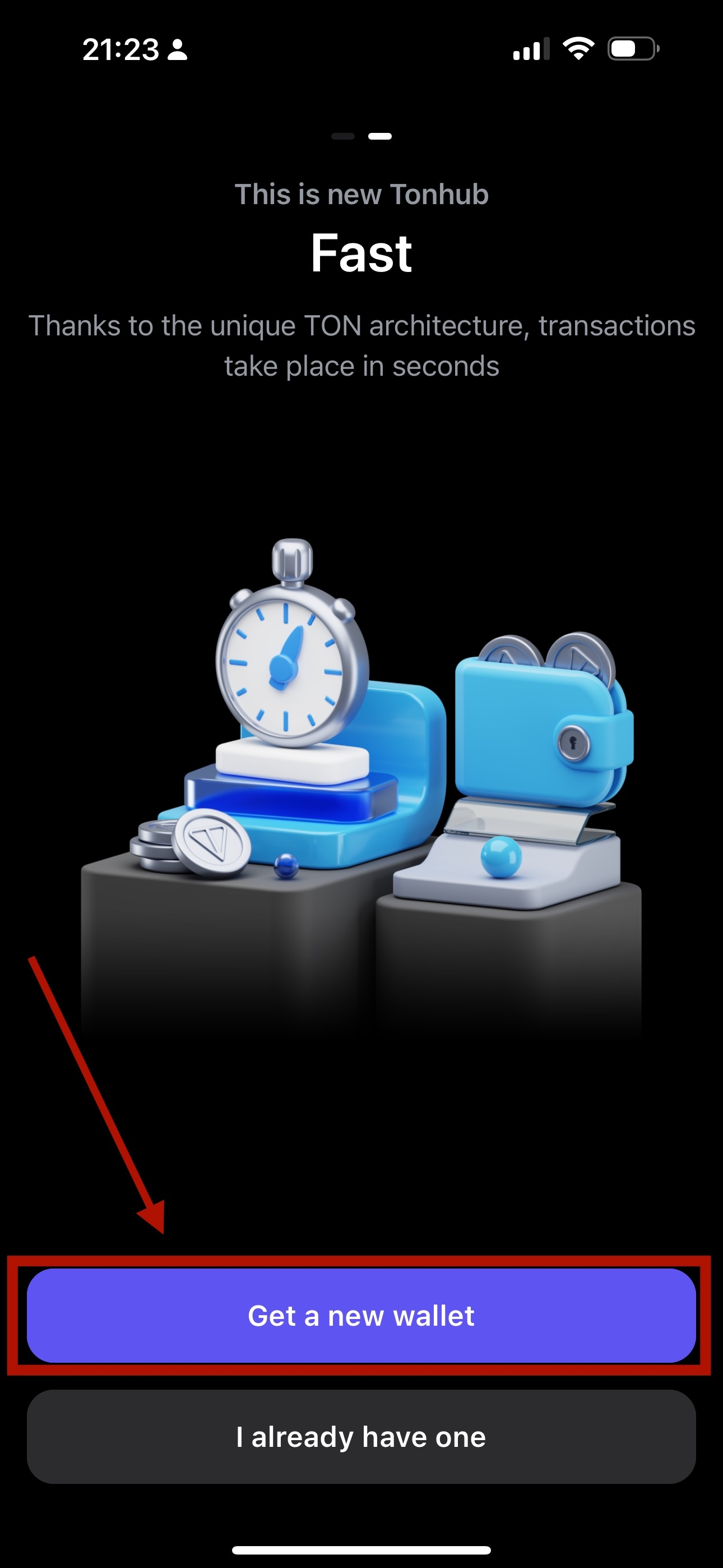 Open the TonHub app and select ‘Get a new wallet’ to create a wallet.