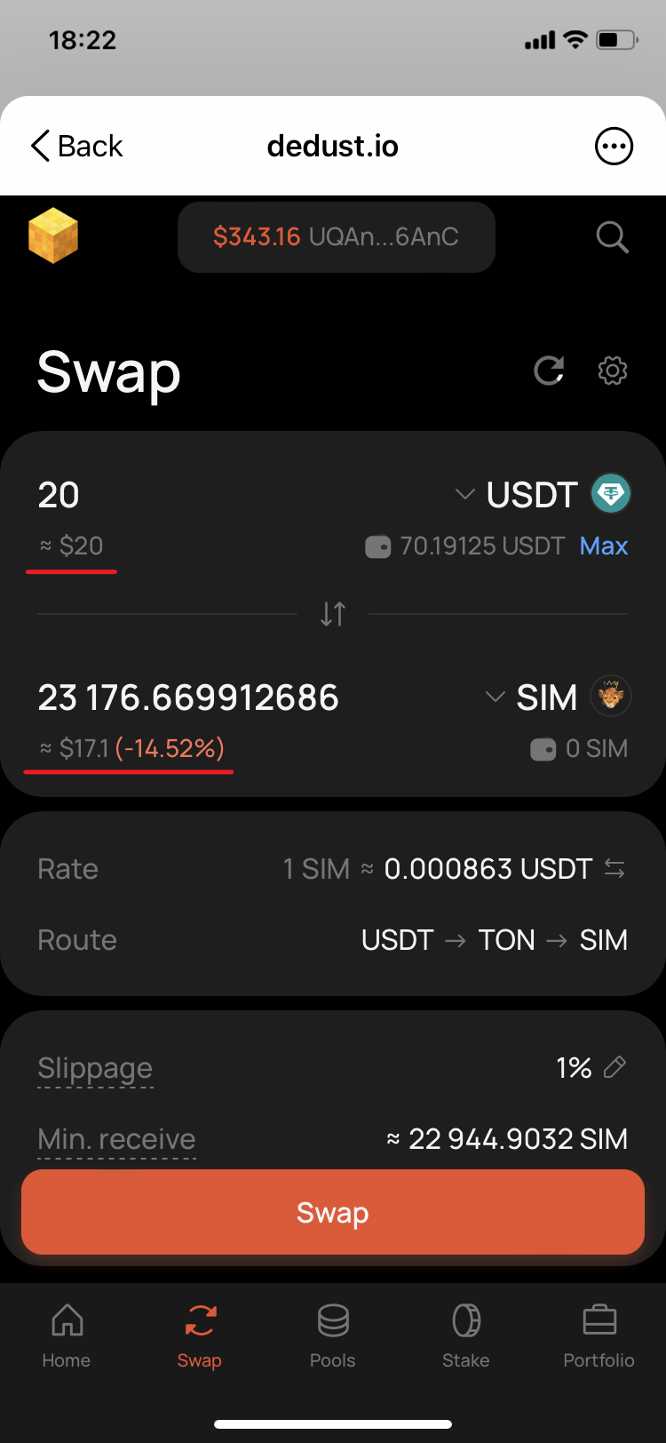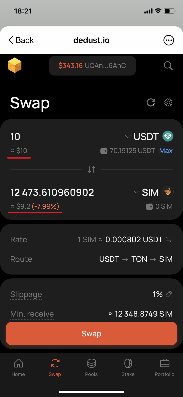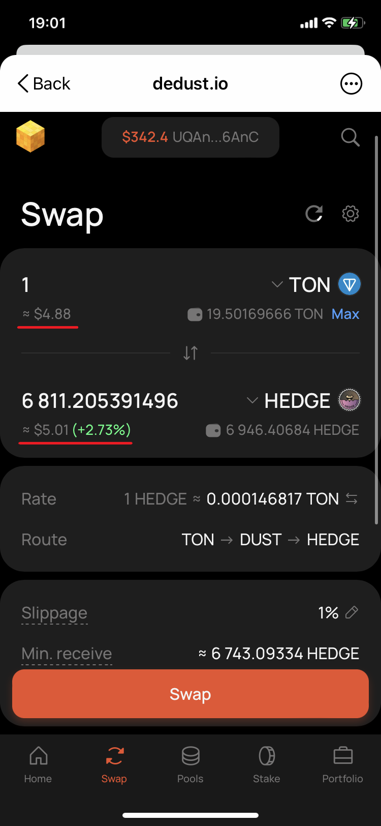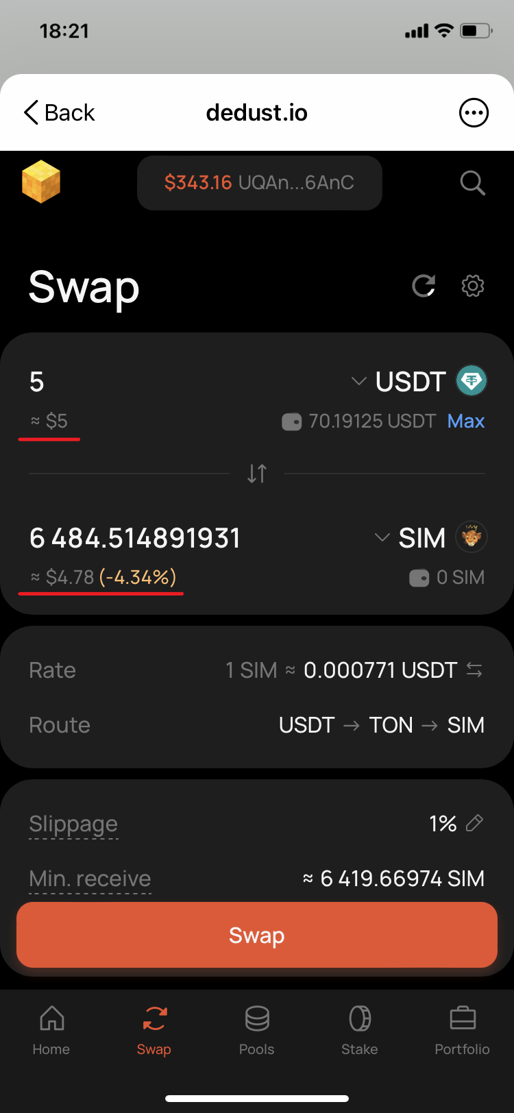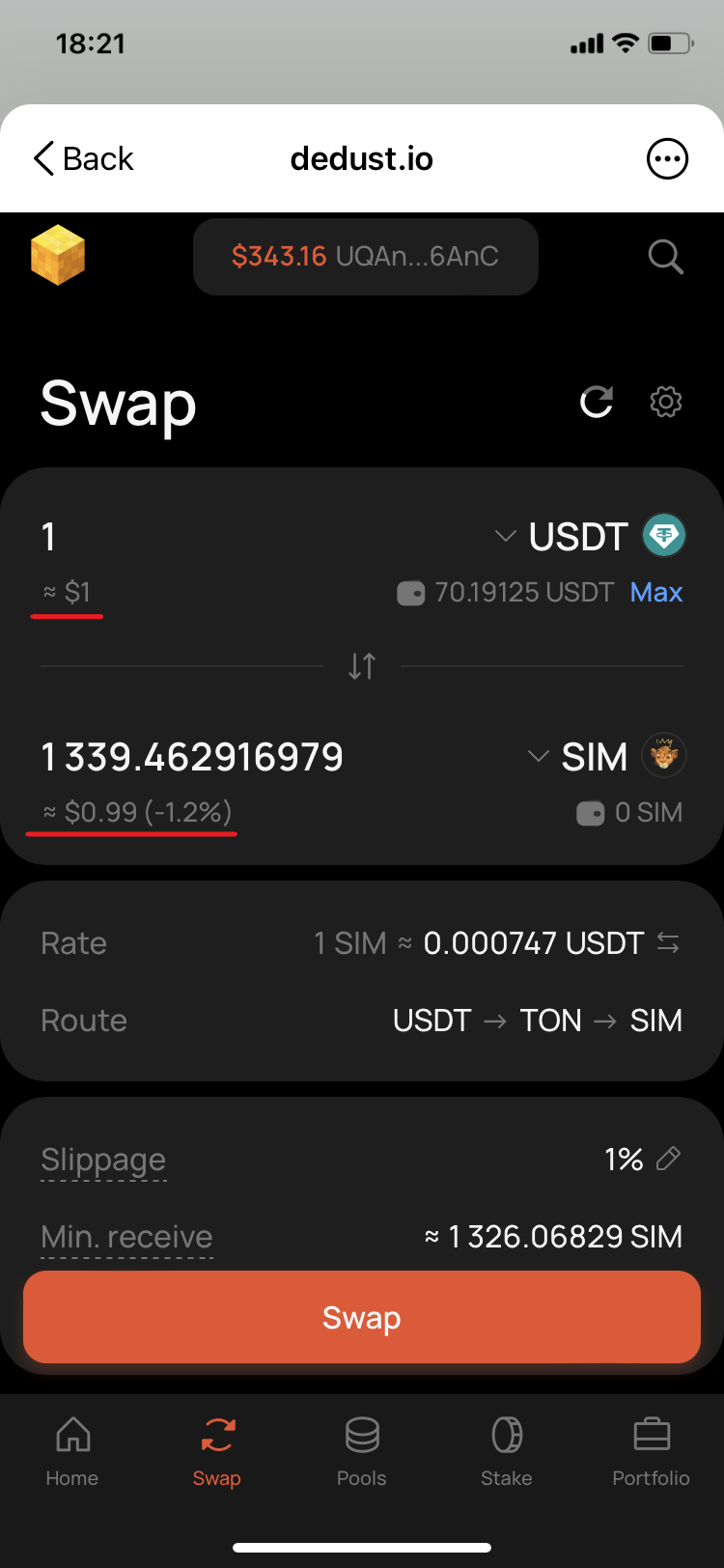 At DeDust.io, for user convenience, besides the direct/reverse exchange rate of two tokens (shown in Rate), both assets value is also displayed in USD ($).