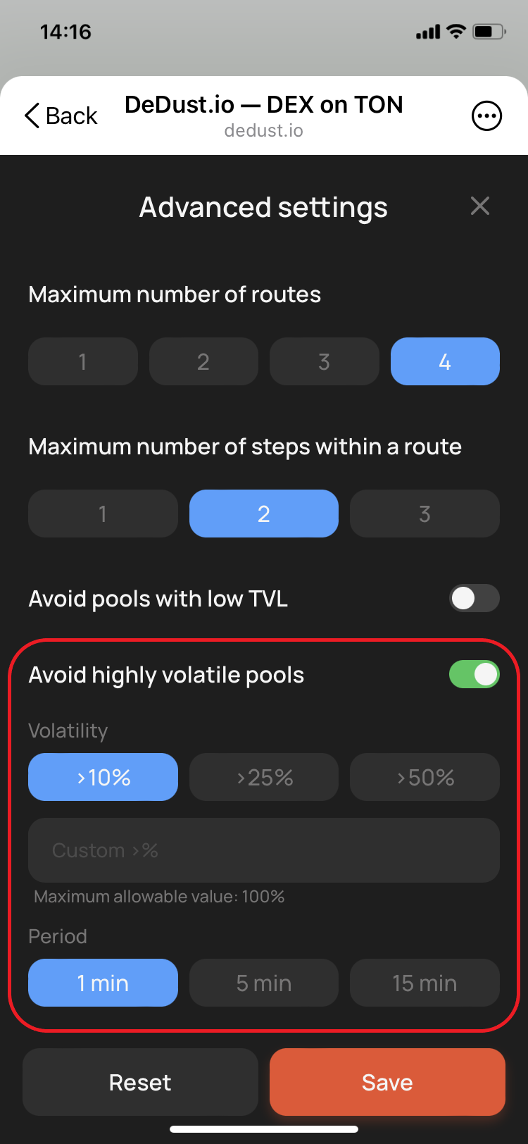 If a trade involves intermediate pools with highly volatile tokens, you may face slippage and failed swap. To make your trades smoother, set two parameters: