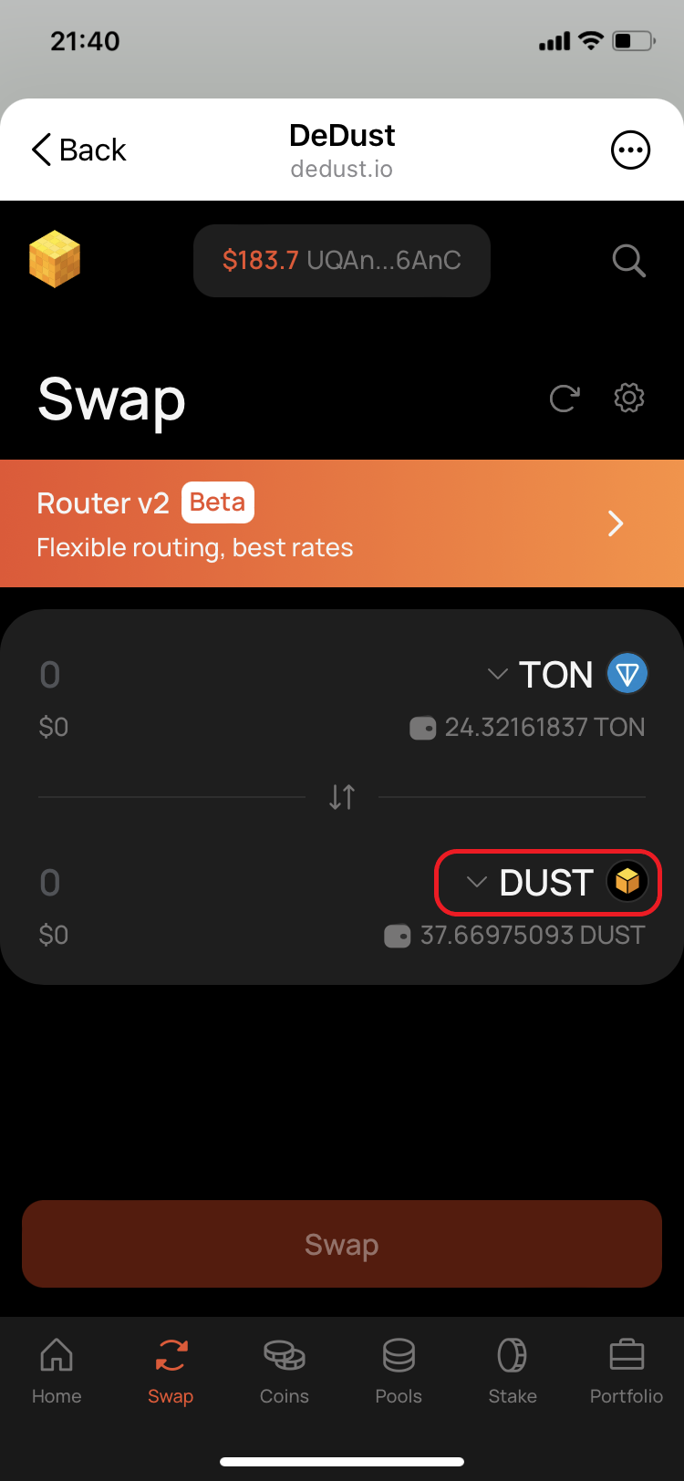Open coins dropdown on Swap page.