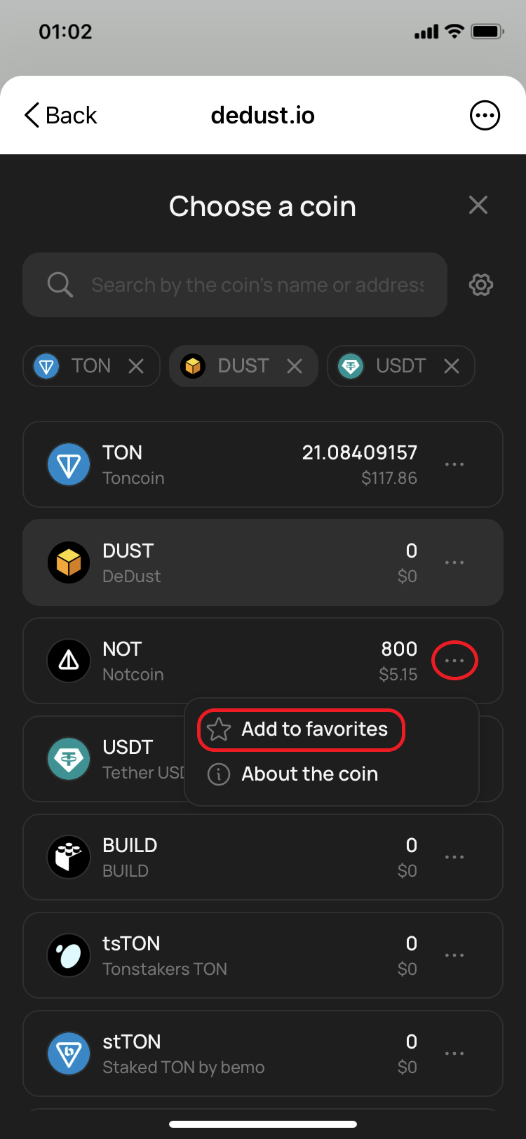 Once you add a token to Favorites in your user settings at DeDust.io, it will be displayed only on the current device and browser (including built-in wallet browsers) or Telegram mini-app that you are using.