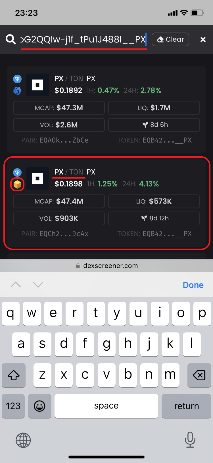 15. Update the page and first check the swap results 👇 As you see, the balance of PX has changed, meaning that this [1 TON -> PX](https://tonscan.org/tx/a4a3294a0ea3bcb200cfb7db1a5205976b67c6dfe9d51e392fd47dd76964b5f3) swap was successful. Let's briefly look at the details: