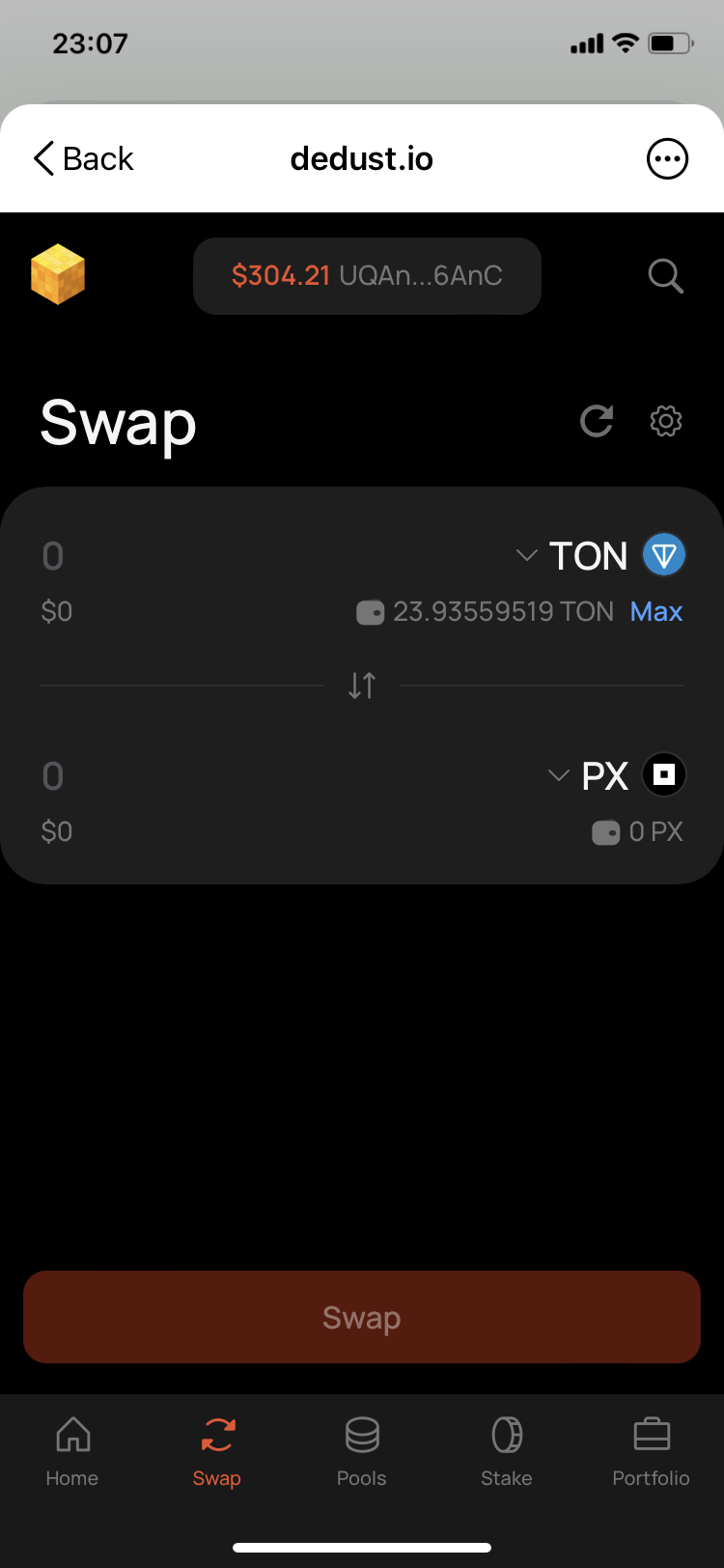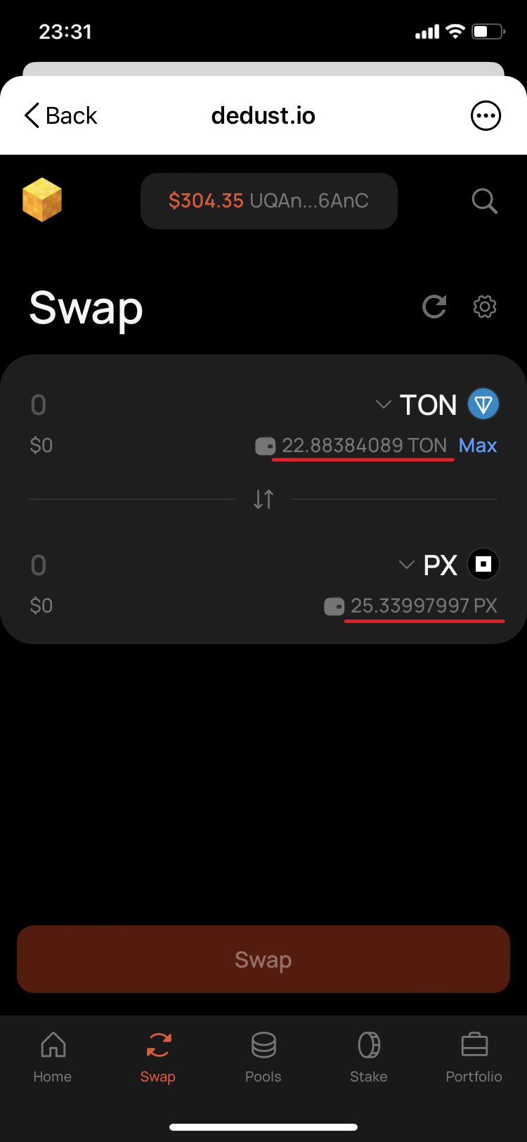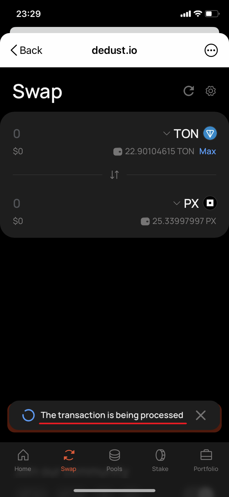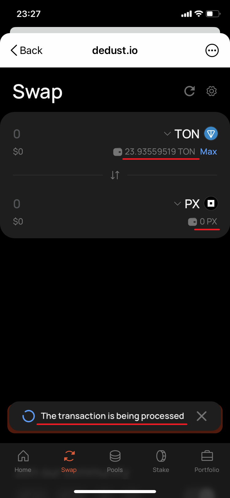 22. Go back to DeDust.io and update the page. In a minute the balance of TON has changed, but much less than should be enough to execute the swap. And the balance of PX remained the same as before the swap. This is a sign that the swap was not fulfilled.