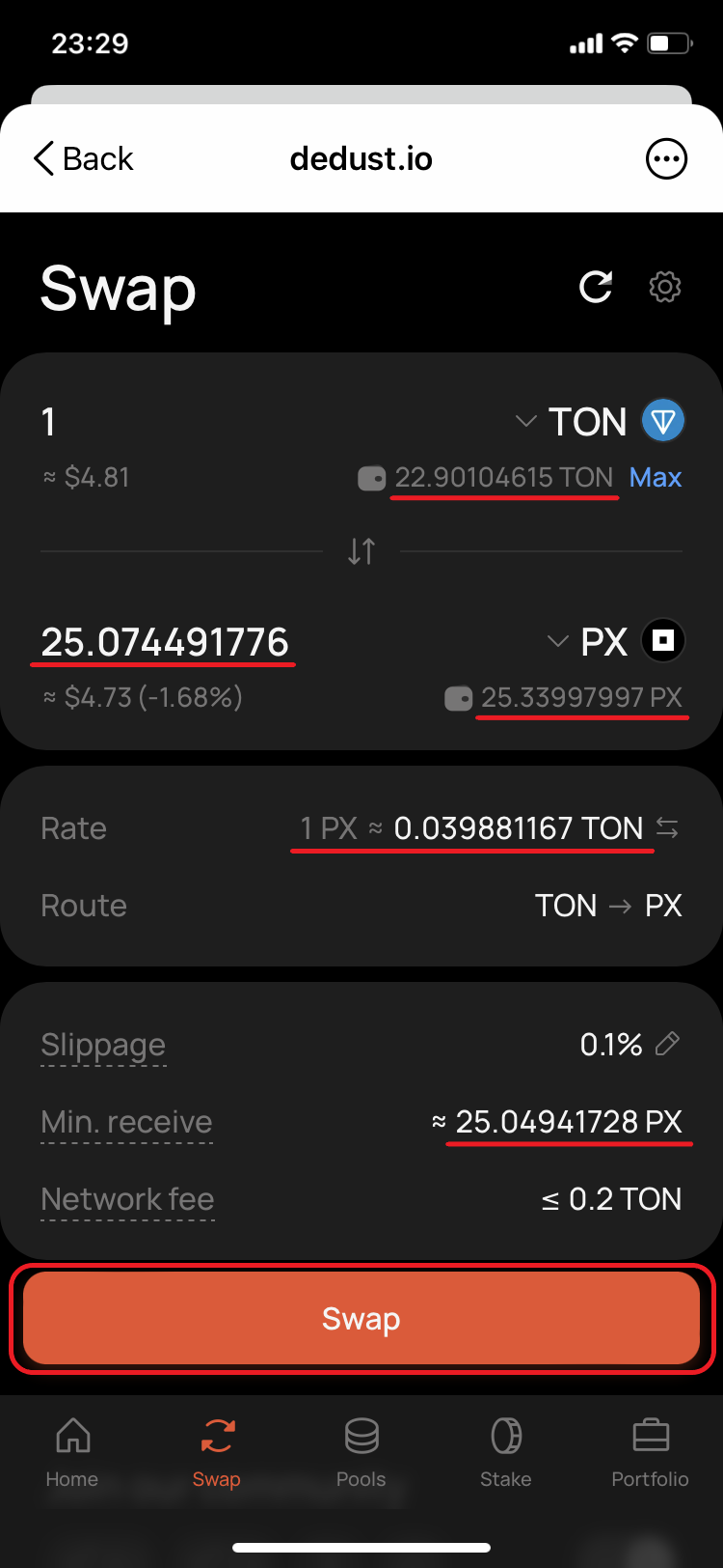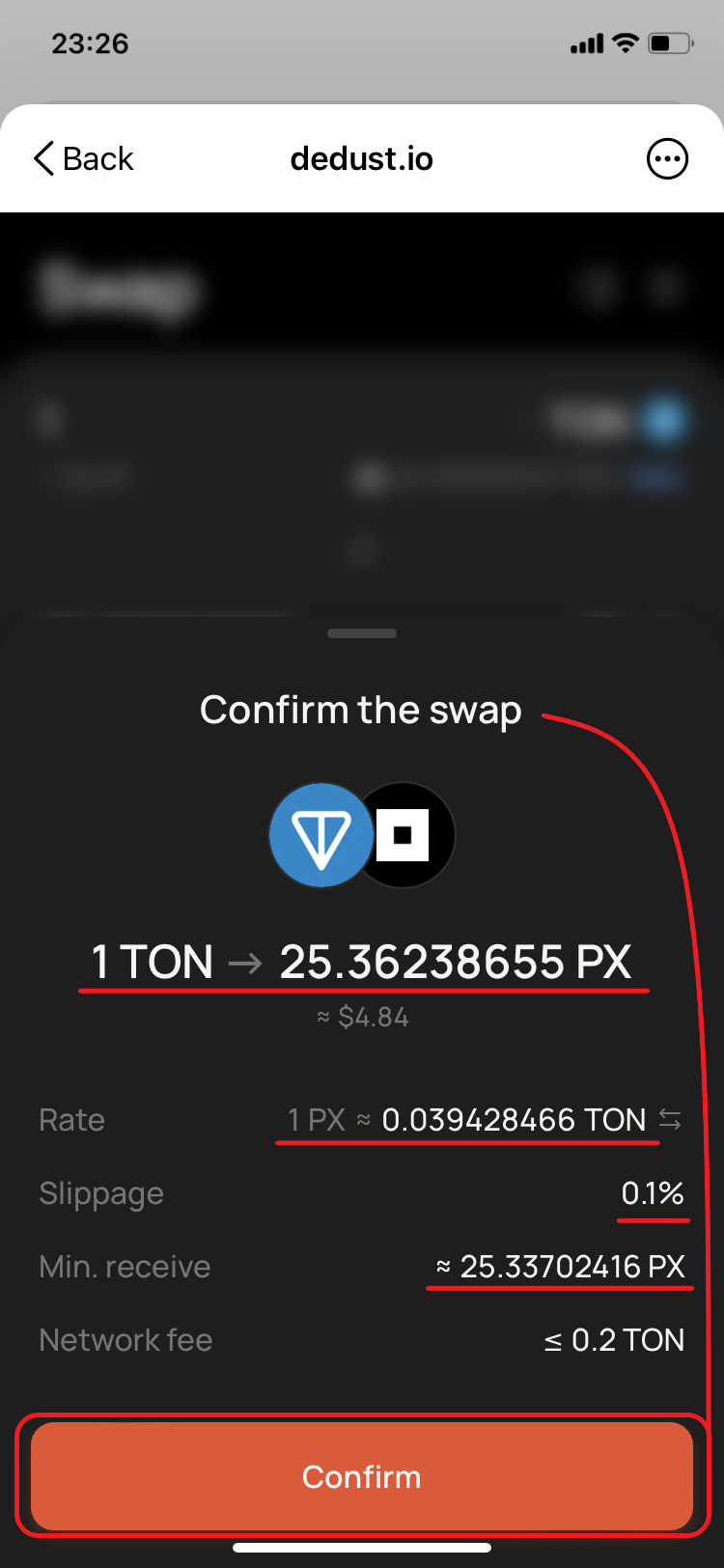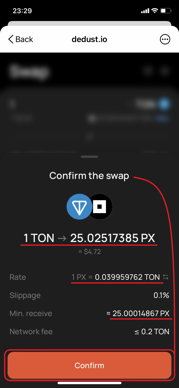 18. Go back to DeDust.io and check again the final conditions. They have changed again. Estimated [amount to receive](#user-content-fn-12)[^12] is ≈25.0252 PX. The new price is 0.039959762 TON for 1 PX. *'Min. receive'* ≈ 25.00014867 PX. Confirm the swap.