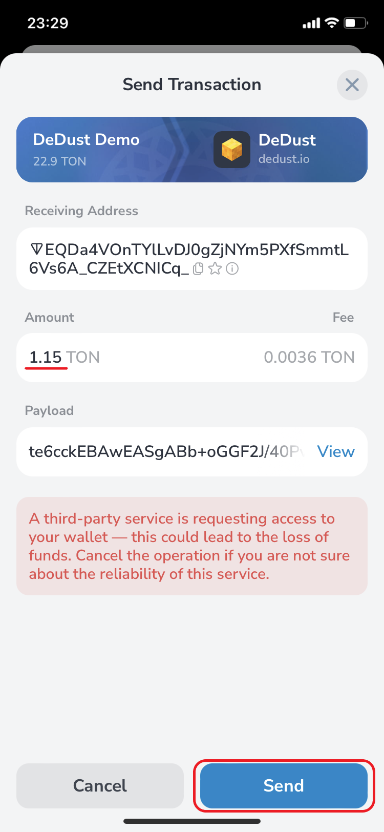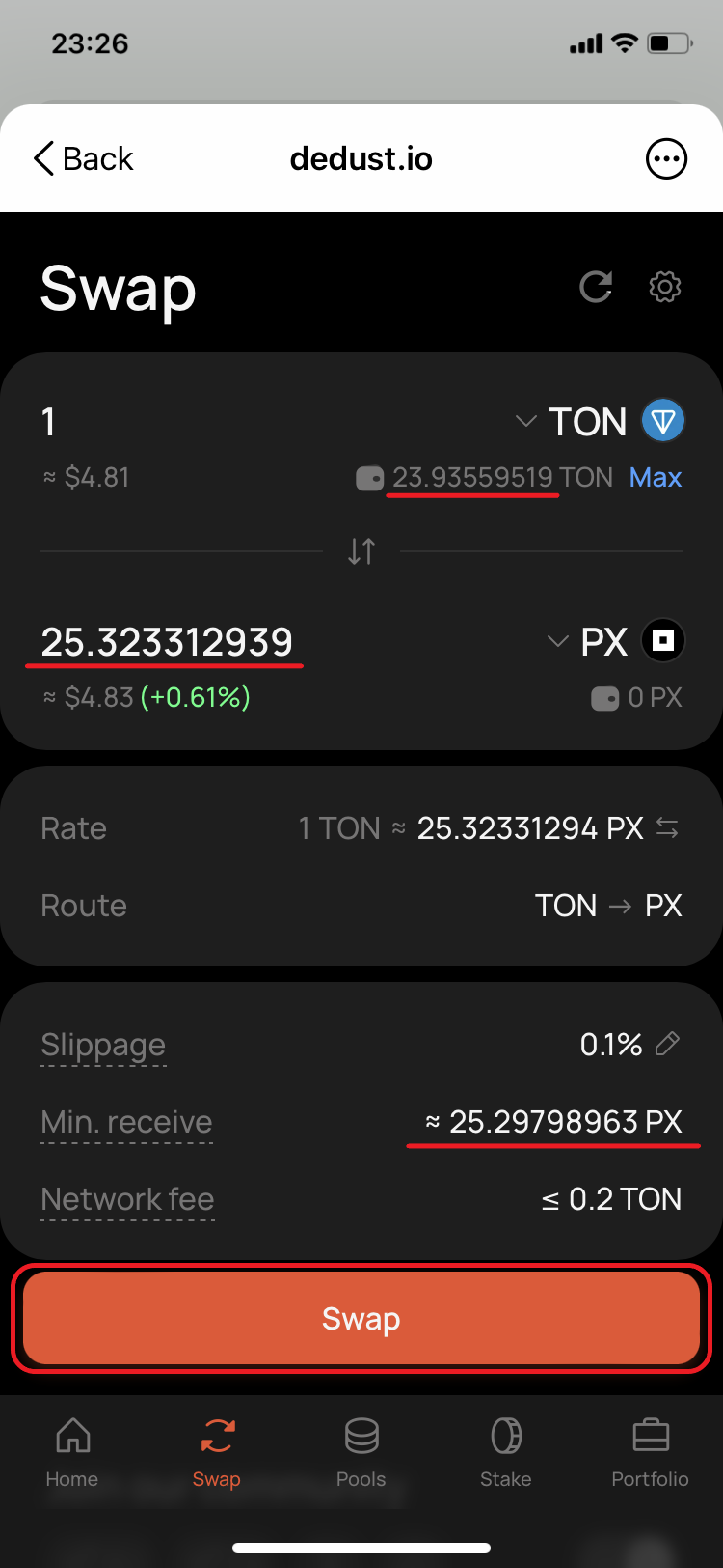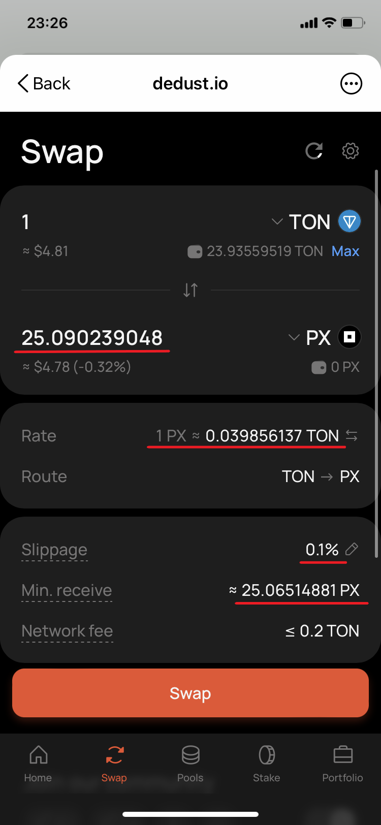 18. Go back to DeDust.io and check again the final conditions. They have changed again. Estimated [amount to receive](#user-content-fn-12)[^12] is ≈25.0252 PX. The new price is 0.039959762 TON for 1 PX. *'Min. receive'* ≈ 25.00014867 PX. Confirm the swap.