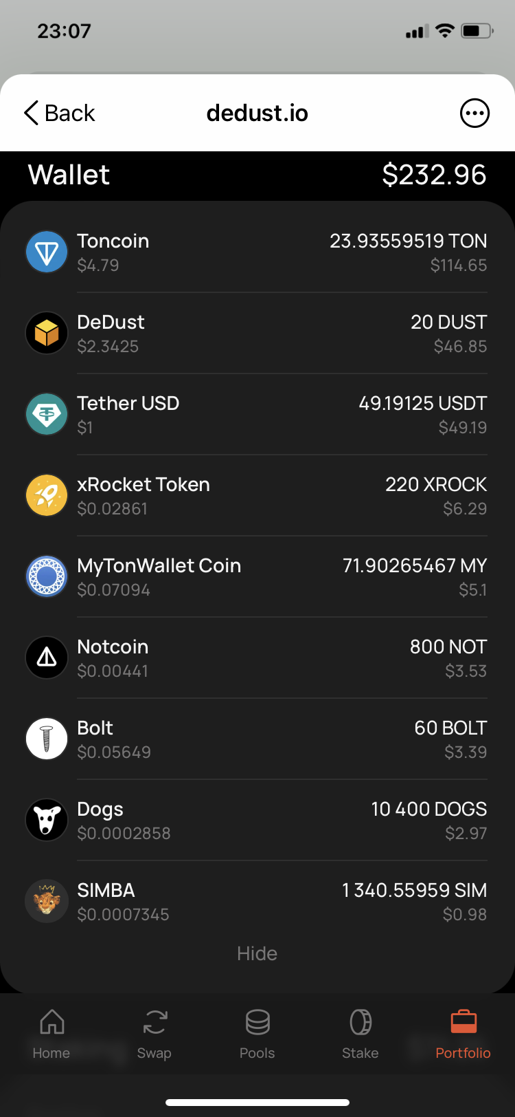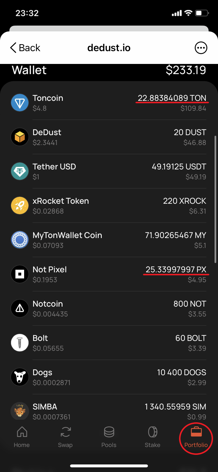 23. Go also to the [Portfolio](https://dedust.io/portfolio) to check that the tokens balances left unchanged here too. Due to a high trading activity the price was rapidly changing, and right at the time you confirmed the swap in your wallet, the price several times moved up, resulting in >0.2% growth:\