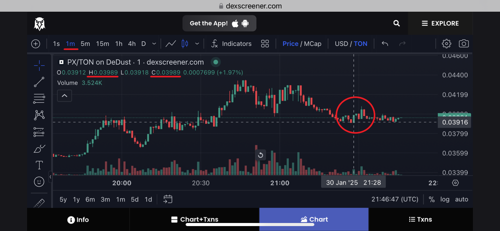 17. Meanwhile go to see the price chart. You now see the confirmation that the price of 1 PX at the moment of previous swap moved first to the level of 0.03943 and then in a few minutes has grown to 0.03989 TON, what is shown on DeDust as the new market price for the swap.