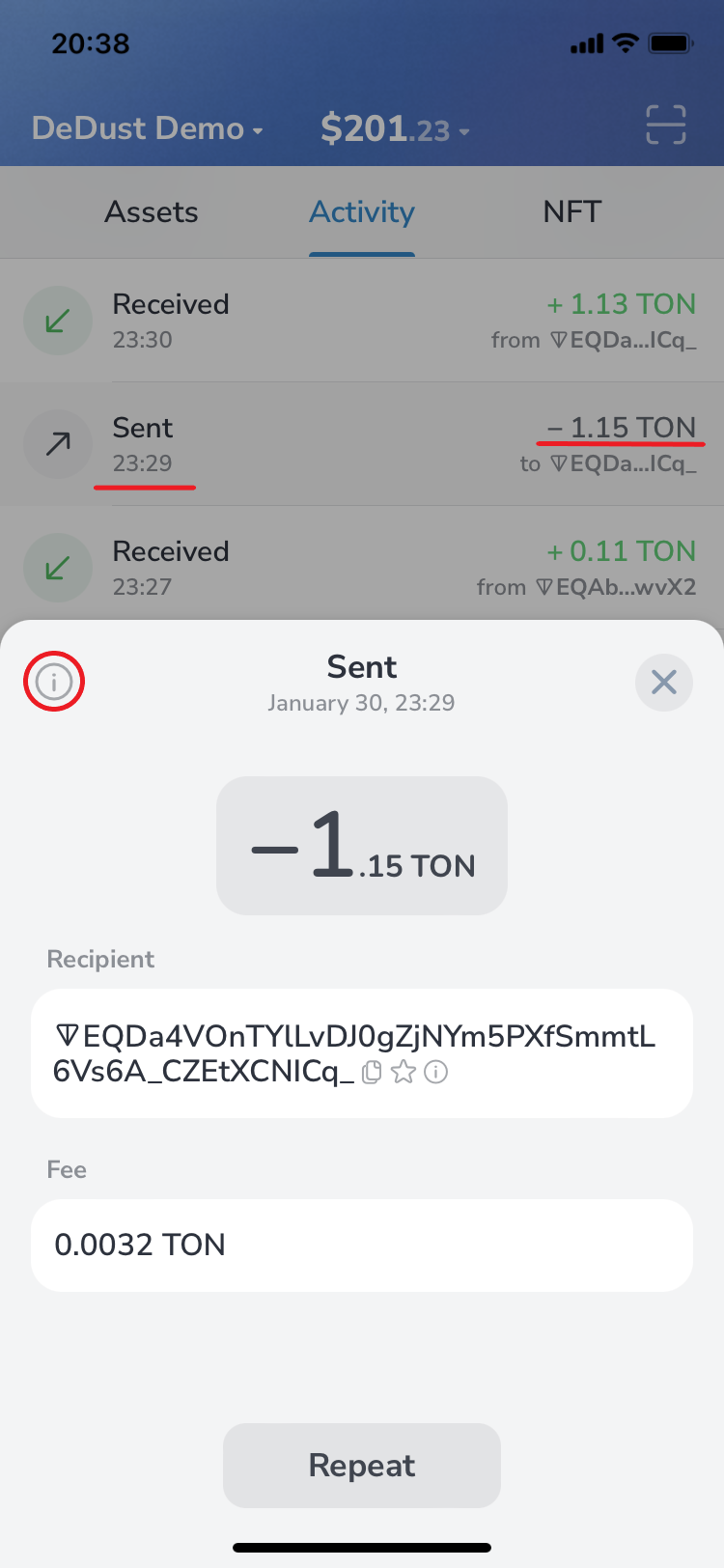 19. Go to the wallet. Check TON amount, including 0.15 TON 'gas' expenses. Sign the transaction.