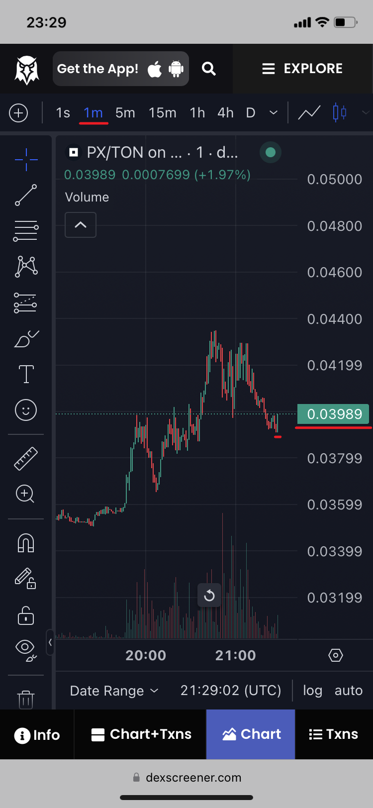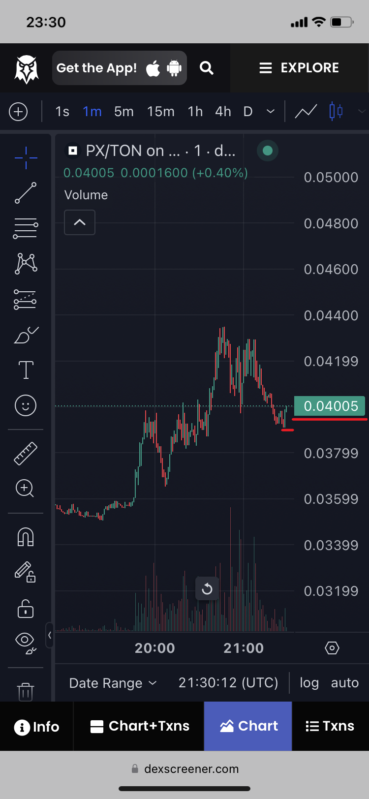 21. Meanwhile go to see the price chart. You see that the price of 1 PX in a couple of last minutes has grown more and even surpassed 0.04 level, and at the moment equals to 0.04005 TON. While the confirmed exchange rate at Step 18 was ≈0.03996 TON.