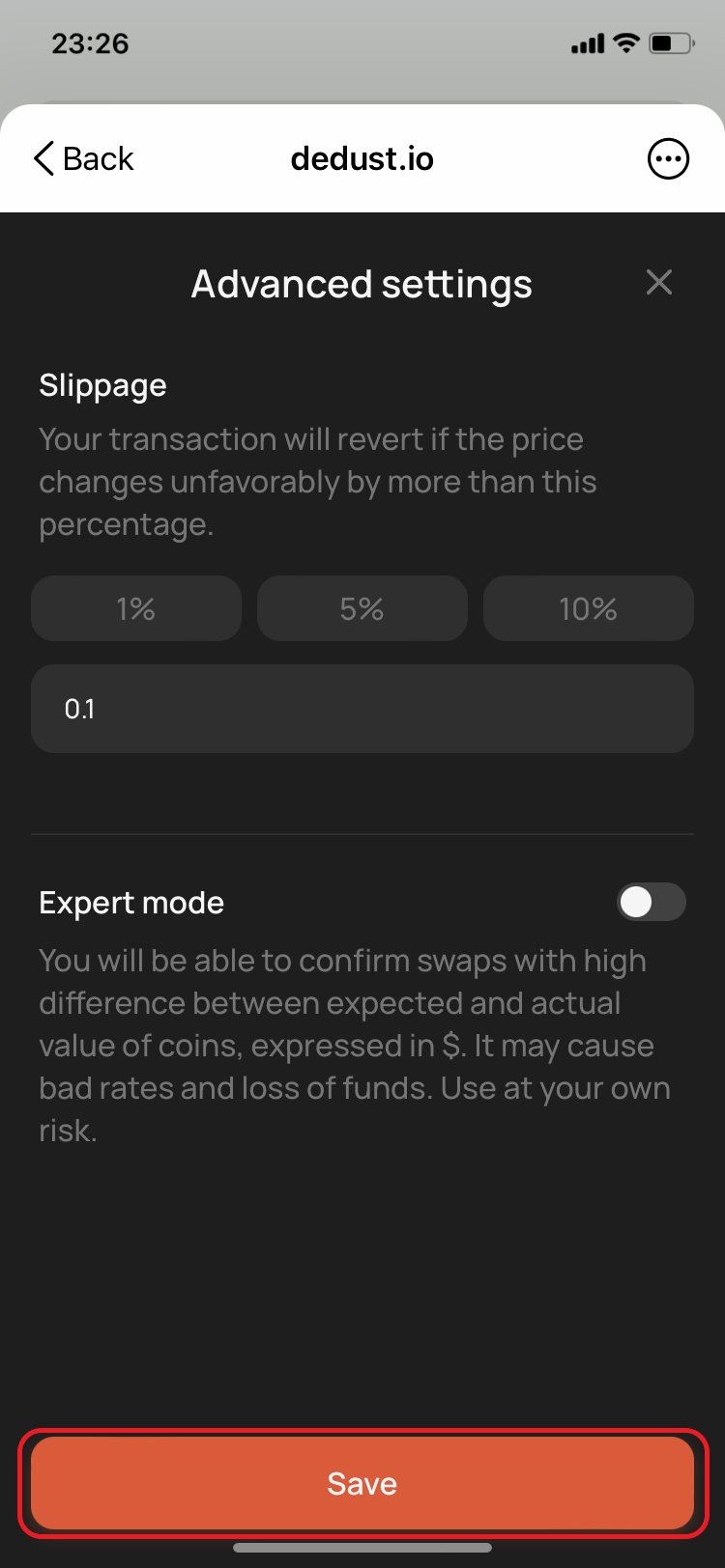 5. Then press *'Save'* to apply your new slippage settings.